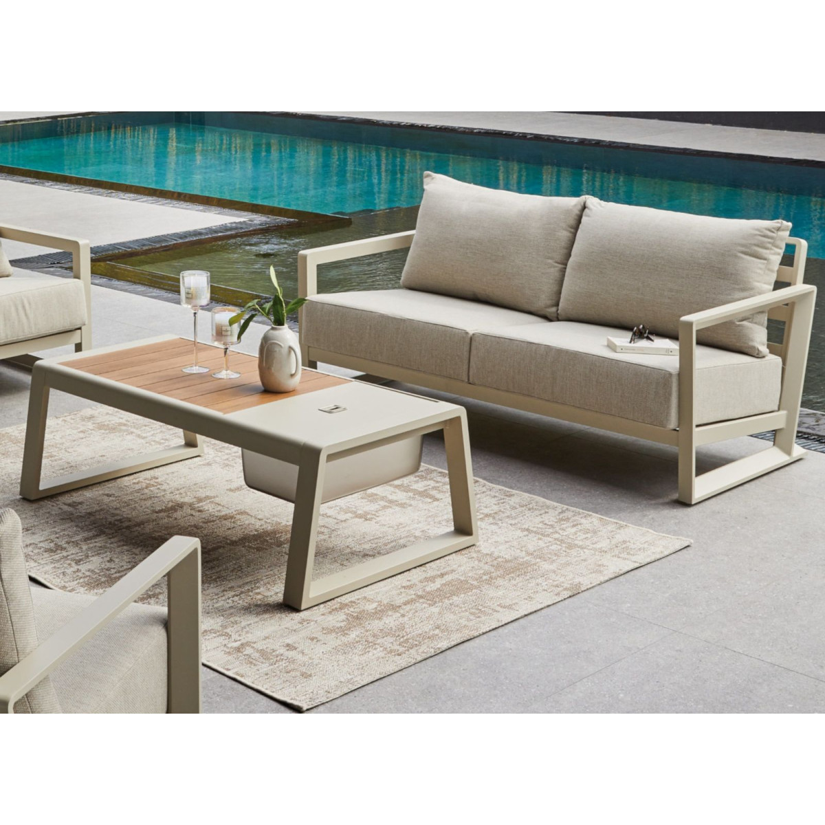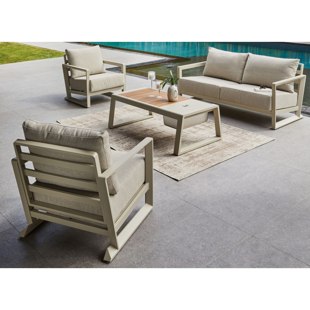 L’ensemble détente Perth séduit par son design à la fois moderne et intemporel et offre un grand confort pour aménager votre espace extérieur, sa structure en aluminium recouverte de peinture époxy garantit légèreté, solidité et résistance aux conditions. Ensemble comprenant 2 fauteuils, 1 canapé 2 places et 1 table basse, hauteur d’assise 40 cm, poids total 68 kg, fabrication Chine, garantie 2 ans extérieures y compris en bord de mer, les coussins épais et déhoussables assurent un confort mi-ferme idéal pour les moments de détente tout en étant adaptés à un usage extérieur grâce à leur traitement déperlant, l’ensemble se compose de deux fauteuils, d’un canapé deux places et d’une table basse rectangulaire dont le plateau à lattes dissimule un bac amovible avec couvercle pour garder vos boissons à portée de main, prêt à accueillir famille et amis, le salon Perth est pensé pour profiter pleinement de la terrasse ou du jardin en toute convivialité