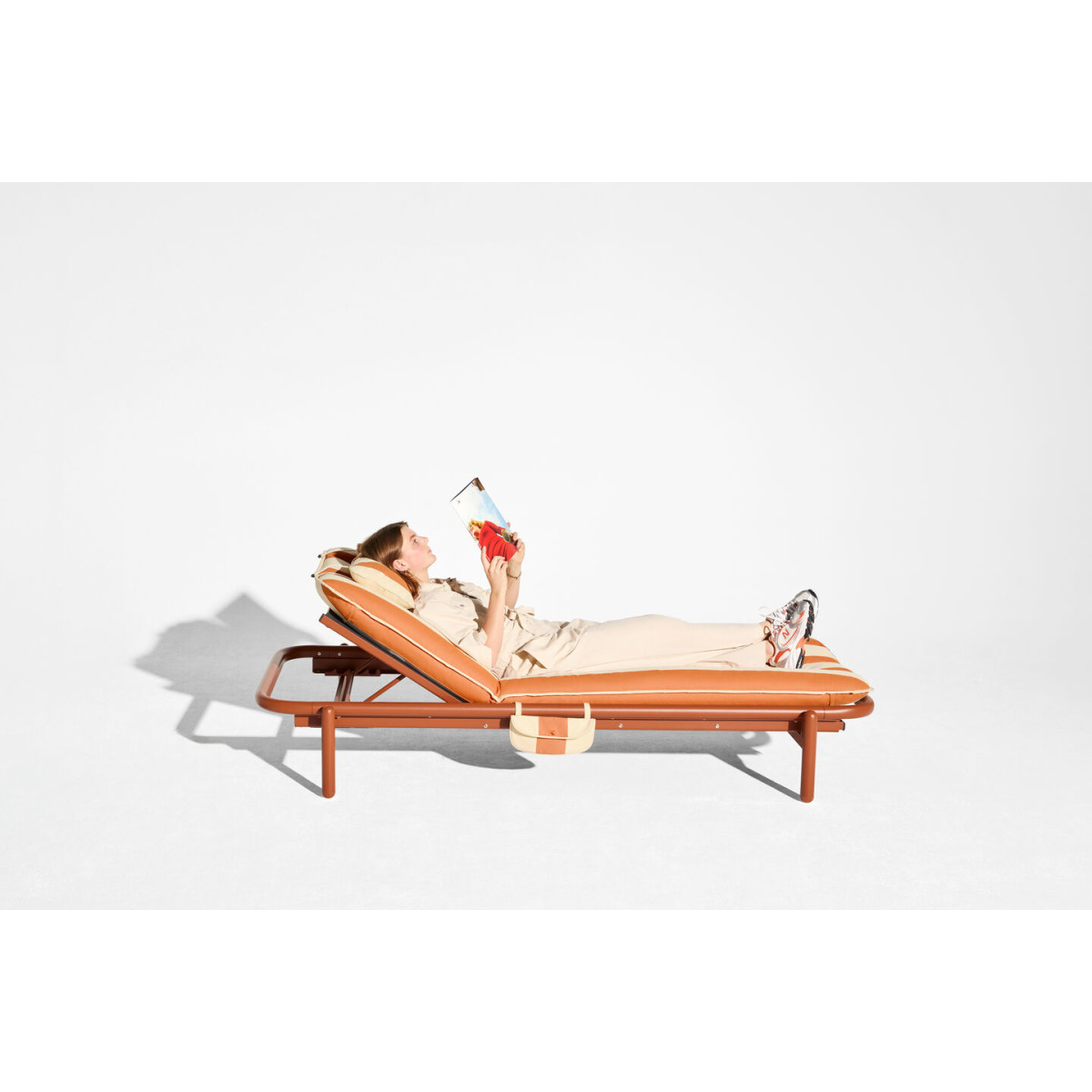 Le Sunbun est un lit de repos spacieux et ultra-confortable où le design nostalgique rencontre le confort contemporain. Son esthétique fait référence aux formes rondes et douces des inflatables des années 70 et 80, mais réinventées avec des matériaux de haute qualité et des détails bien pensés. Le cadre en aluminium de 85 cm de large est résistant aux UV et aux intempéries, facile à assembler et réglable en quatre positions. Le Sunbun Cushion est fabriqué en tissu oléfine avec un revêtement respirant, une face inférieure en mesh aéré et un rembourrage en mousse confortable qui garde une belle tenue. Grâce aux anses pratiques, tu le positionnes facilement. Tu reçois aussi un coussin repose-tête et une petite pochette de rangement. Que tu prennes le soleil, que tu lises ou que tu te détendes simplement, le Sunbun trouve sa place partout dans ton espace extérieur et t’invite à profiter d’un vrai moment de lounge.