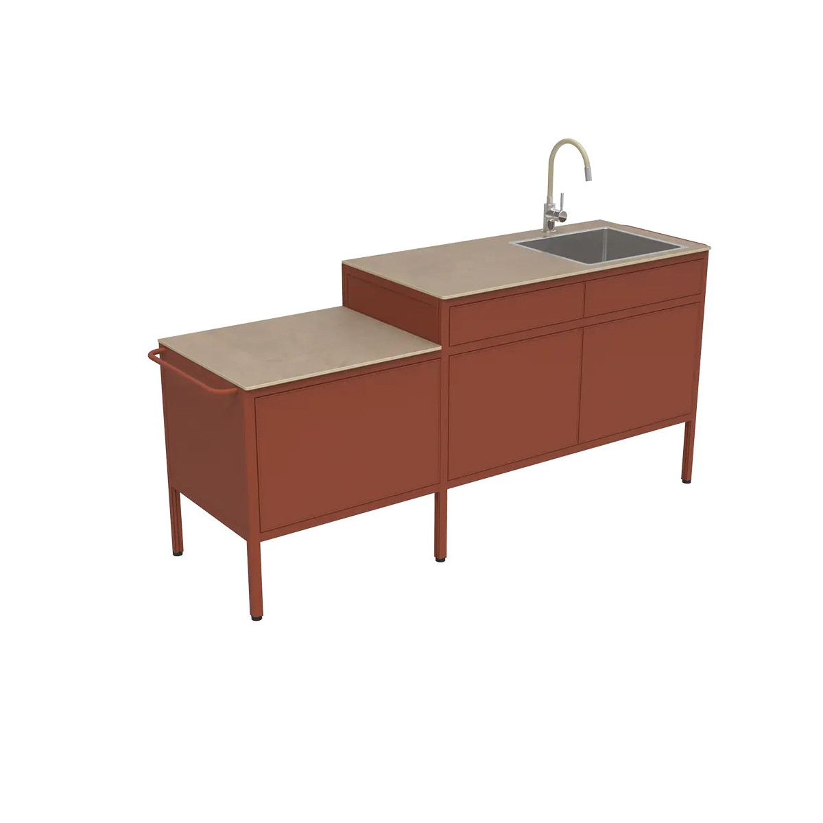 La cuisine d’extérieur La Gourmande GOOSTO de Fermob, proposée en ocre rouge, revisite l’art de cuisiner au jardin avec une approche moderne et structurée. Pensée comme un véritable espace de préparation, elle associe un design aux lignes affirmées à une teinte chaleureuse qui s’intègre naturellement en extérieur. Sa conception modulaire permet d’organiser facilement les zones de travail et de rangement pour un usage fluide, au quotidien comme lors des réceptions. Sa structure en aluminium assure solidité et résistance aux conditions extérieures, tandis que le plan de travail en HPL offre une surface fiable, adaptée aux variations de température et à l’humidité.
