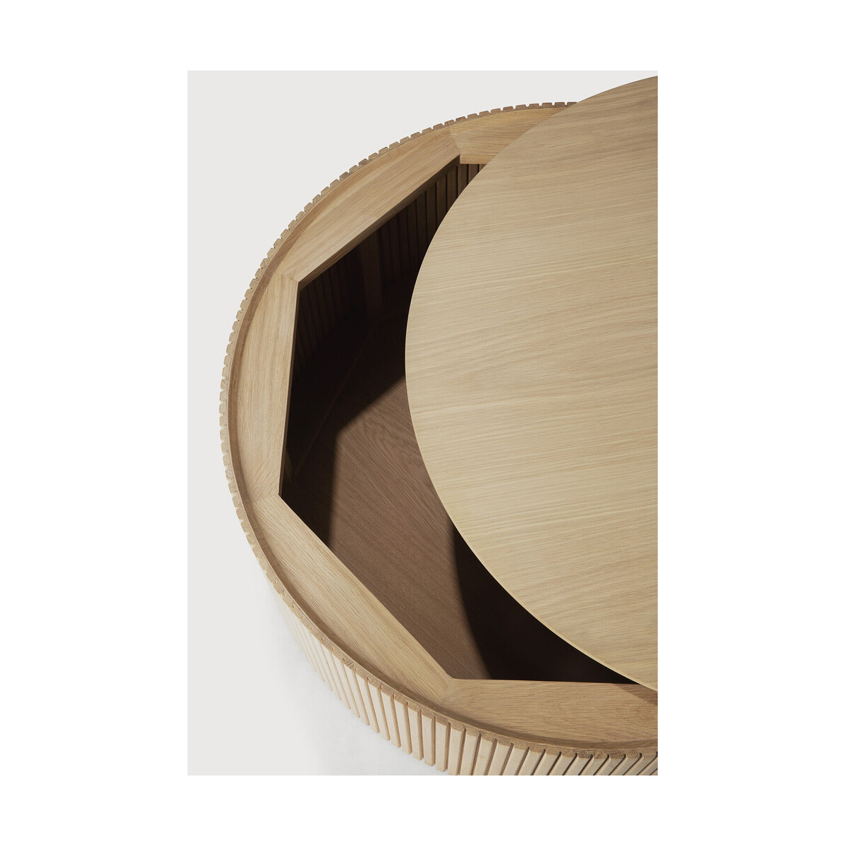 La table basse ronde Roller Max, imaginée par Jacques Deneef, se distingue par son design ingénieux et polyvalent. Réalisée en chêne massif avec finition huilée, elle associe élégance naturelle et fonctionnalité. Son plateau amovible s’intègre parfaitement dans le piètement rainuré et se soulève facilement pour révéler un espace de rangement discret, idéal pour cacher journaux, plaids, jouets ou accessoires du quotidien. Ce concept malin en fait une solution parfaite pour optimiser les petits espaces tout en préservant un style raffiné. Aucun montage n’est nécessaire : la Roller Max est prête à sublimer votre salon dès son installation. Une pièce astucieuse et contemporaine qui conjugue esthétisme et praticité.